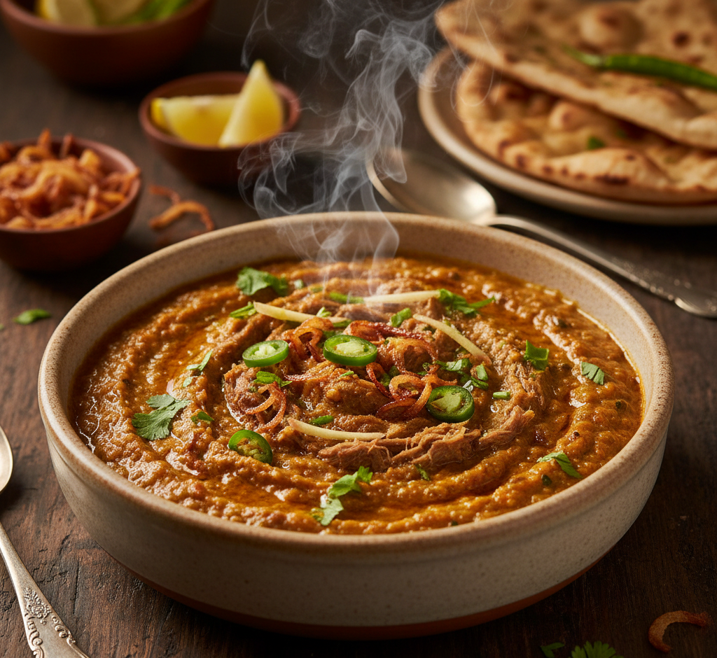 Thick traditional haleem cooked with wheat, lentils and shredded mutton.