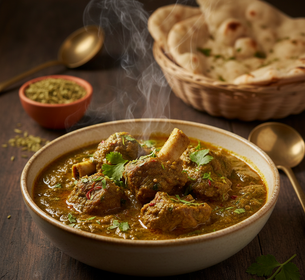 Mutton cooked with fenugreek leaves.