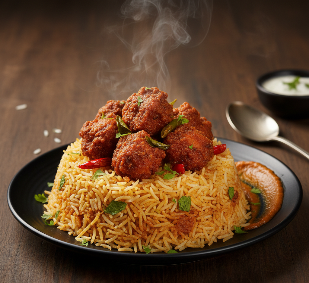 Small serving biryani topped with spicy fried Chicken 65 pieces.